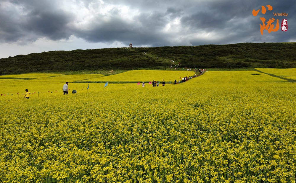 一場(chǎng)細(xì)雨過后,微風(fēng)吹拂,金黃色的花朵隨風(fēng)搖曳。游客們置身花海,賞花、拍照,盡情享受大自然饋贈(zèng)的田園詩意。