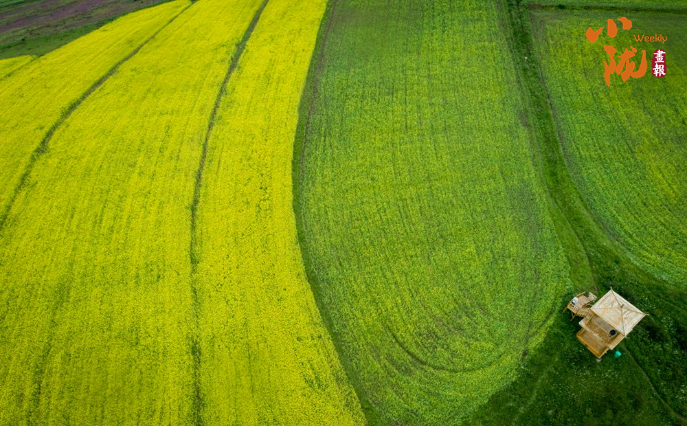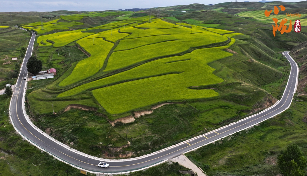 黃燦燦的油菜花鋪蓋在逶迤的山坡上,染盡山野,與此起彼伏的祁連山脈、古樸的民舍、一望無際的田野,共同繪就了一幅極具藝術(shù)感的“油畫”。