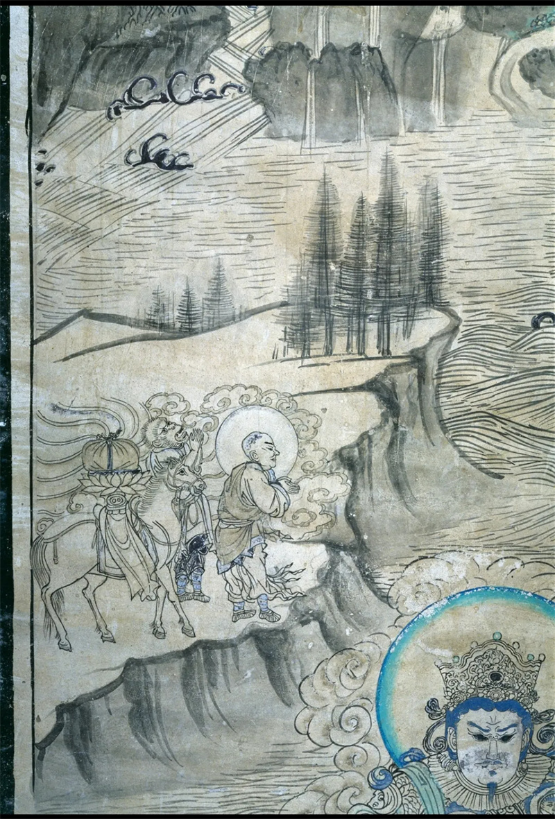 敦煌壁畫中現(xiàn)存六幅唐僧取經(jīng)圖,其中時代最早、保存最完好的一幅繪于西夏時期榆林窟第3窟的《普賢變》中。此幅唐僧取經(jīng)圖似是唐僧師徒在取經(jīng)途中遭遇難關(guān),誠心祈求菩薩協(xié)助渡難。圖中,唐僧身披袈裟,雙手合十,彎腰向前,遙望普賢菩薩參拜。唐僧身后,長相似猴的人雙手合十,抬頭仰望,向普賢致禮,他就是孫悟空的原型——石磐陀。師徒身后有一匹白馬,靜立等待。他們站在懸崖深壑前,面前呈現(xiàn)山窮水盡已無路的困境。