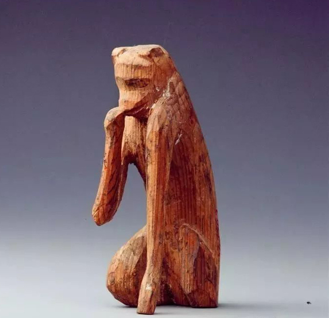 木猴,東漢,1957年甘肅武威磨嘴子出土。此猴跪坐,頭微低,左前肢垂直撐地,右前肢伸至嘴部,似在抿嘴偷笑,又似在品嘗食物。整個雕塑用黑、紅兩色彩繪,形體小巧,刀法簡練,將一只調(diào)皮的猴子微感惶惑的瞬間神態(tài)刻畫入微。該作品用一塊木頭雕成,是漢代雕刻中的佳作。