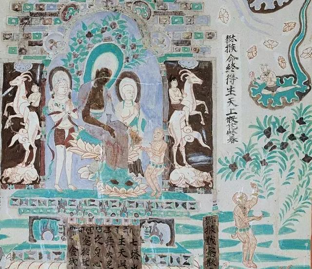 壁畫畫面右側(cè)有一飛天正在散花,云端之下是一棵茂盛的大樹,一只猴子正仰著頭,一手舉起做采摘狀。其旁側(cè)有白底墨書題記寫著“獼猴命終得生天上散花供養(yǎng)”。畫面右側(cè)一佛坐蓮花座之上,兩旁一弟子一菩薩協(xié)侍左右,一只猴子雙手捧一缽,虔誠地供養(yǎng)佛。