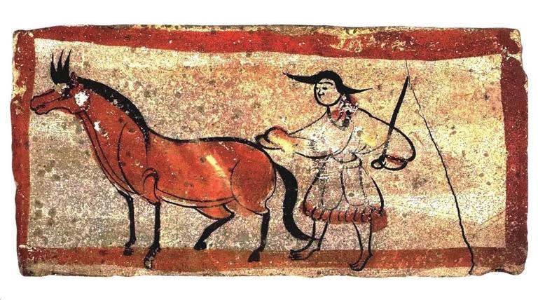 《牧馬圖》,1979年甘肅省嘉峪關(guān)市新城12號(hào)墓出土。