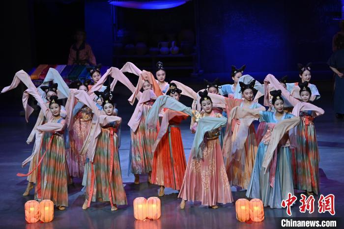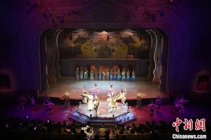 9月5日晚,甘肅敦煌旅游熱度不減,眾多游客觀看大型洞窟式沉浸體驗劇《樂動敦煌》。該劇溯源敦煌文化,借助對莫高窟壁畫、藏經(jīng)洞古籍進行解讀,用全息投影、3D威亞等高科技手段,以全沉浸式的呈現(xiàn)方式,演繹西域少年追尋藝術的傳奇故事。劇中運用了琵琶、排簫、阮等民族樂器及仿制敦煌古樂器的音色,通過胡旋舞、腰鼓舞、琵琶舞等典型舞蹈,展現(xiàn)了敦煌壁畫中的樂舞盛景,全面展現(xiàn)敦煌傳承千年的樂舞文化魅力。九美旦增 攝