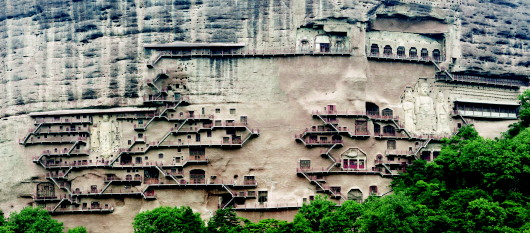 在天水市區(qū)東南40余公里的茫茫西秦嶺林海之間,一座酷似民間麥垛的孤峰突兀而起。沿懸崖絕壁上凌空環(huán)繞的棧道迂回盤行,一座座懸空開鑿的洞窟中,供奉著數(shù)以千計、千姿百態(tài)的佛像。孤峰四周林海蒼茫、群山疊翠,洞窟內(nèi)泥塑佛像、精美壁畫,交相輝映,令人嘆為觀止。
