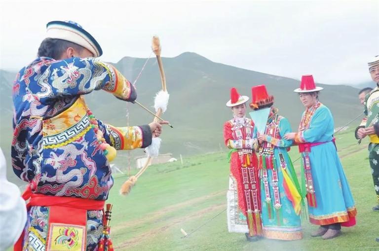 按照裕固族風(fēng)俗,在贈(zèng)羊小腿的同時(shí),要向新娘舉行射無(wú)簇箭的儀式,新郎向新娘連射三支沒(méi)有箭頭的箭,象征新郎新娘相親相愛(ài),白頭到老。射罷,新郎把弓箭折斷,扔到門旁,由老人投進(jìn)火里燒掉。