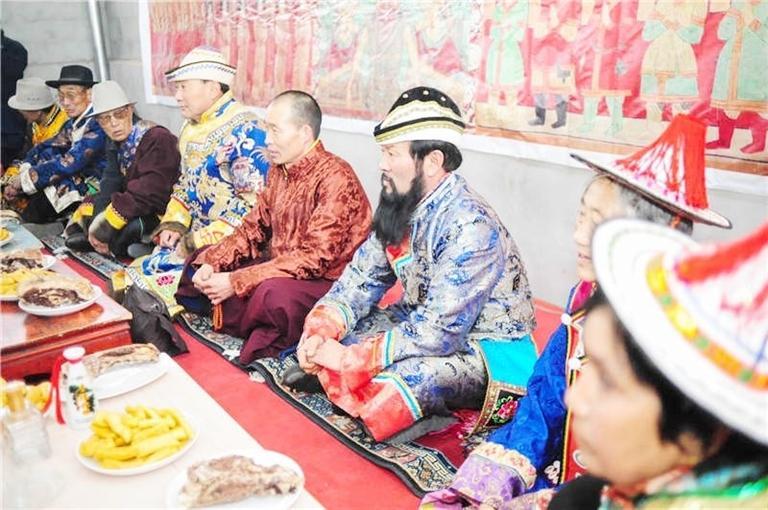 送親隊(duì)伍來(lái)到時(shí),迎親的人們向女方客人贈(zèng)送哈達(dá),表示敬意。然后,送親的人下馬飲酒吃飯,謂之“打尖”。