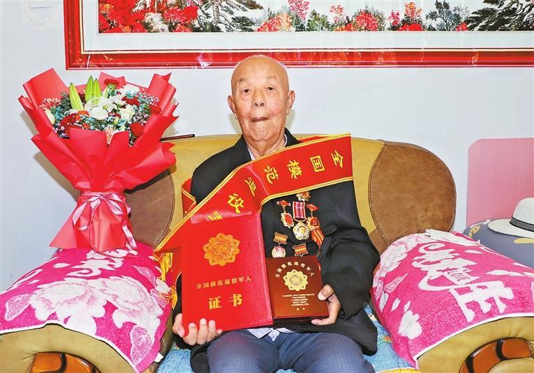 當(dāng)天,平川區(qū)武裝部、退役軍人事務(wù)局的工作人員為胡占學(xué)帶來了“全國模范退役軍人”榮譽(yù)證書、勛章和綬帶,并為老人佩戴了勛章。