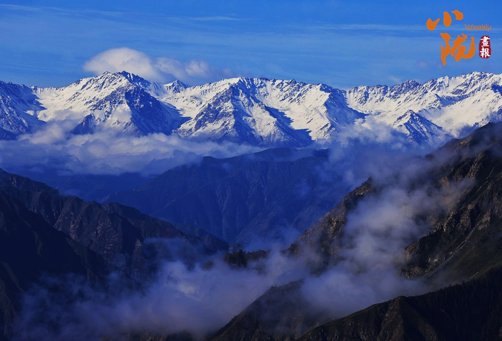 湛藍的天空下祁連雪峰銀裝素裹,峰巒間云霧繚繞,秋意蔓延。群山莽莽,天地一色,展現(xiàn)出祁連山獨有的雄渾和壯美。