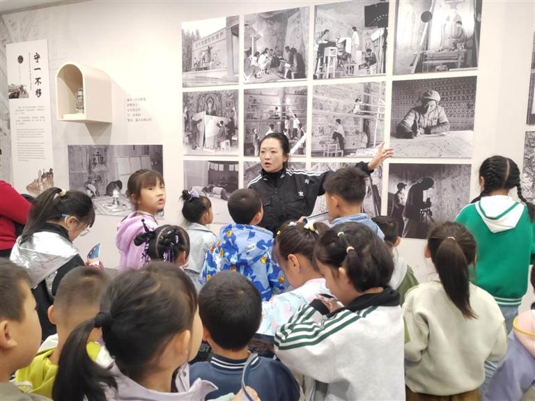 為了使小朋友們能夠身臨其境感受敦煌文化的魅力,主持人還為每一位小朋友發(fā)放了一本“敦煌小畫(huà)師”的研學(xué)手冊(cè),并帶領(lǐng)大家前往蘭州市圖書(shū)館“近鄰”——敦煌藝術(shù)館進(jìn)行了一場(chǎng)藝術(shù)研學(xué)之旅。在敦煌藝術(shù)館內(nèi),孩子們見(jiàn)證了第220號(hào)石窟的壯觀,欣賞了館內(nèi)200余件文化展品,追溯了莫高窟的歷史淵源,了解了壁畫(huà)繪制和建筑元素的藝術(shù)審美,學(xué)習(xí)了“壁上丹青”的顏料密碼。