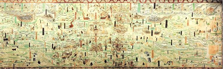 莫高窟61窟,建于五代晚期,是河西歸義軍節(jié)度使曹元忠及夫人開鑿的功德窟,又稱“文殊堂”,主要為供奉文殊菩薩而修。該窟的亮點是西壁的巨幅五臺山圖。這是敦煌壁畫中規(guī)模最大的山水人物圖,也是全景式歷史地圖。五臺山圖長13.6米,高3.5米,畫中詳細(xì)描繪了東起河北正定,西至山西太原,方圓五百里的山川地形及社會風(fēng)情,再現(xiàn)了五代時期五臺山佛國圣境的氛圍。