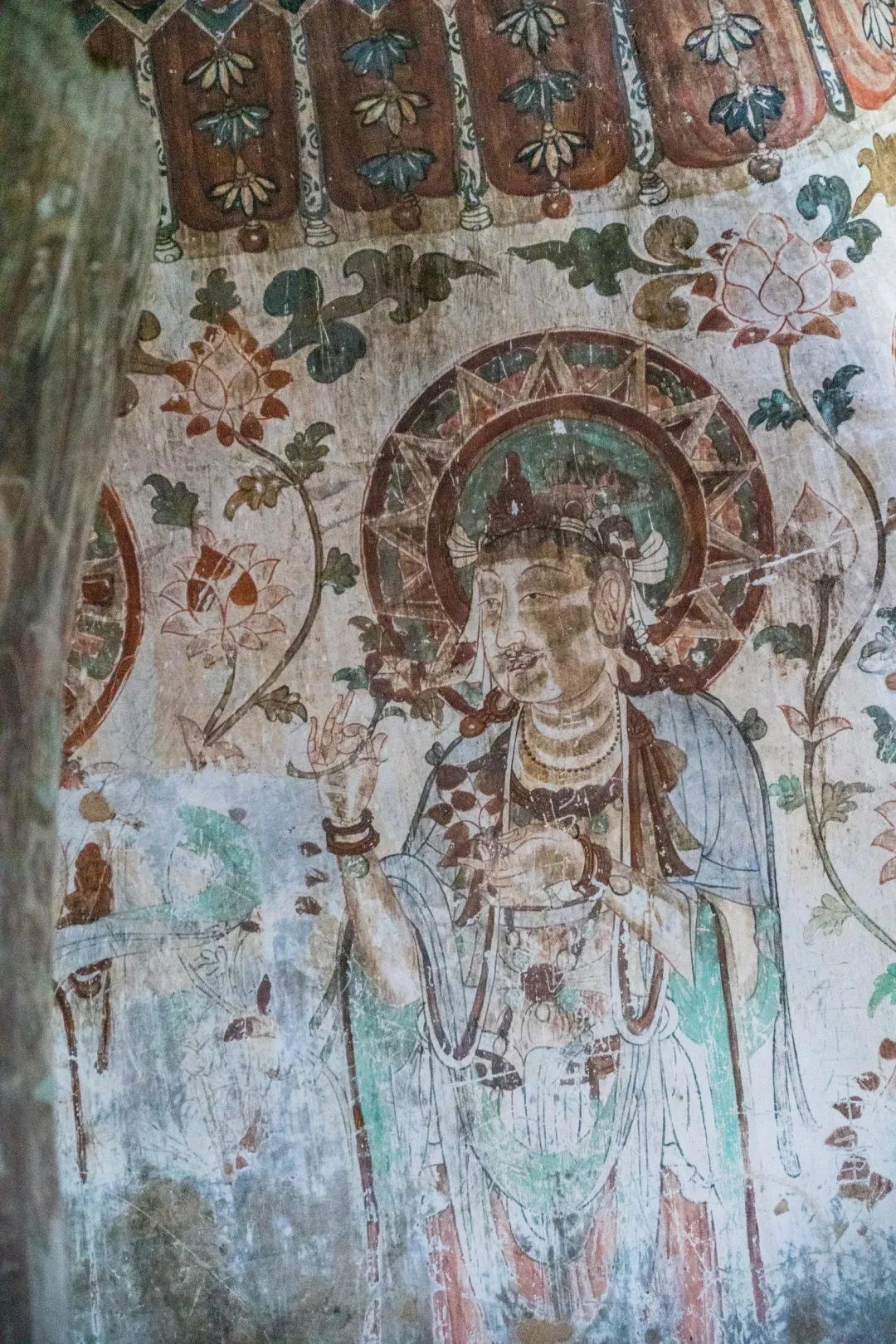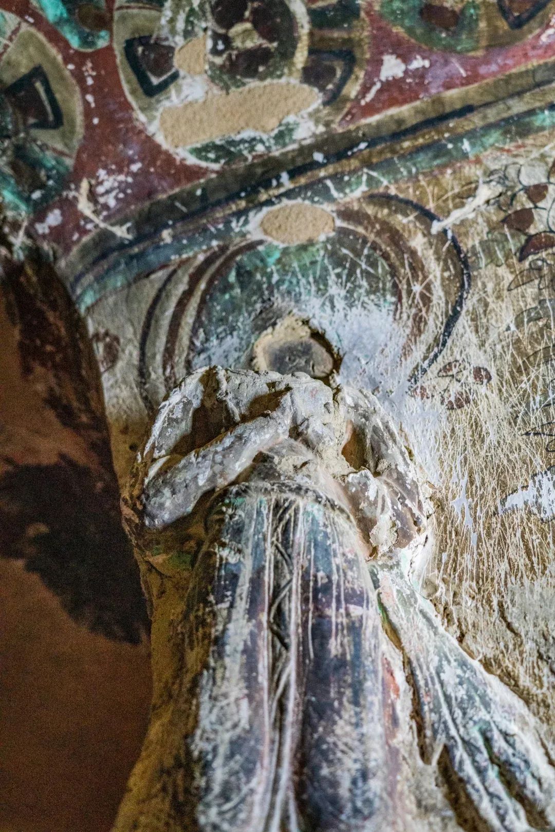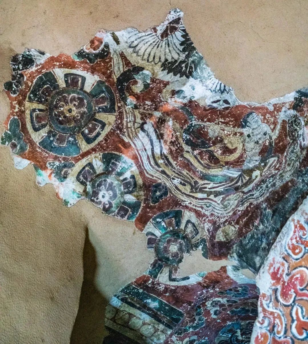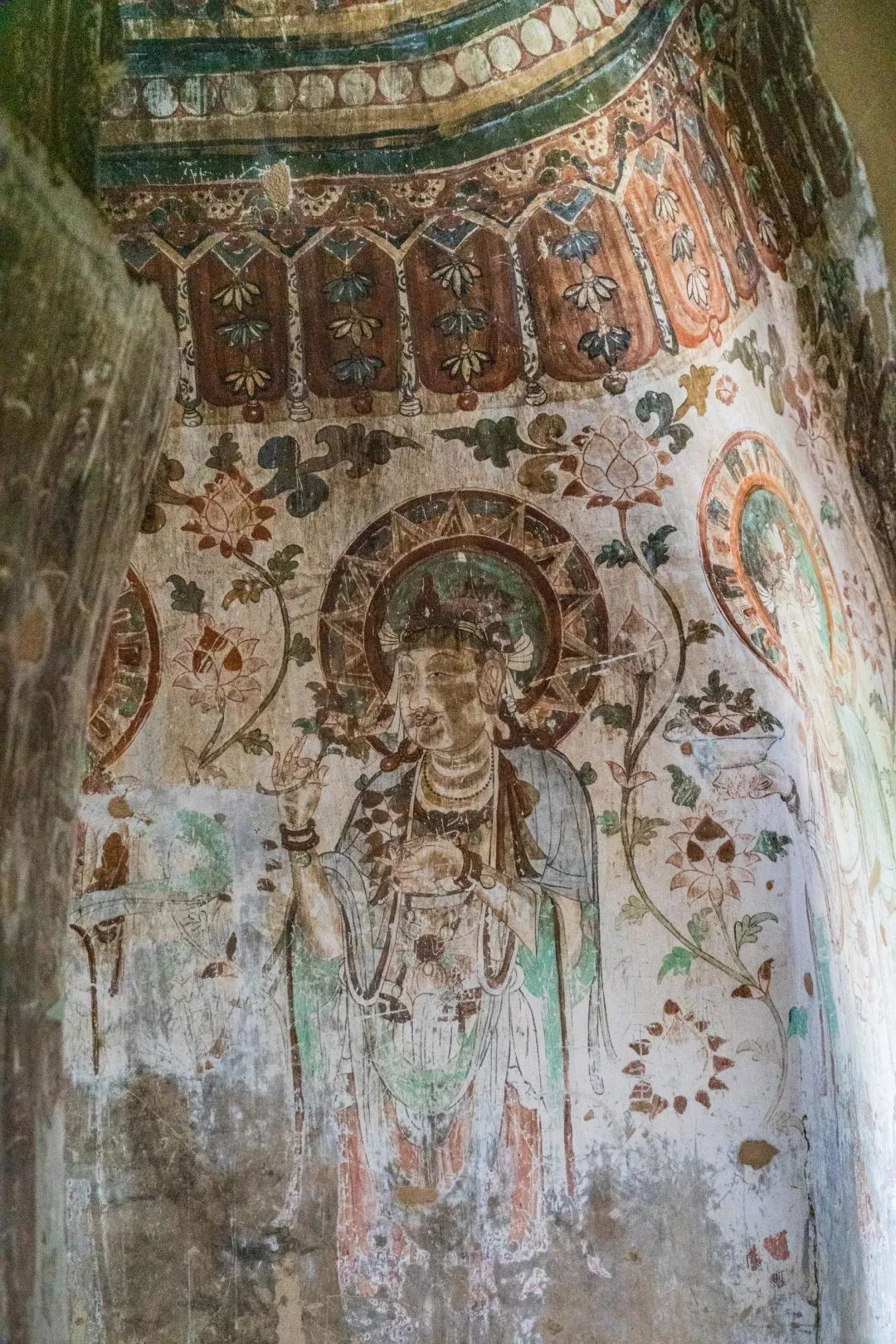 昌馬石窟第4窟洞窟形制及其殘存的塑像對于研究中國早期石窟藝術(shù)與佛教造像藝術(shù)極其重要??邇?nèi)壁畫內(nèi)容是四壁上方畫條式旌幡,下畫供養(yǎng)菩薩,身高近2米,今殘存20身,菩薩周圍畫纏枝蓮,與第二窟基本相同??唔斍鞍氩康卣檀蟛糠置撀?,靠近中心柱正面上部右側(cè)的部位殘存龜形六瓣團(tuán)花圖案與一身飛天及菊花紋圖案。后部中心柱頂部周圍窟頂表面繪龜形六瓣團(tuán)花、連珠紋等圖案。