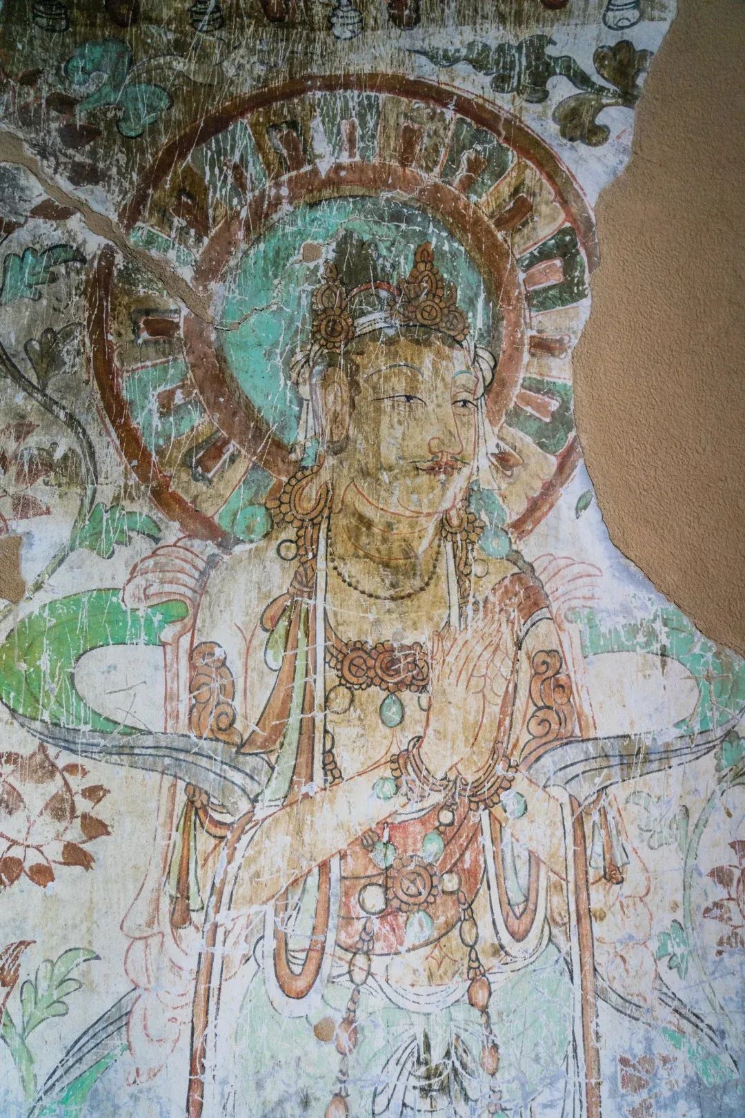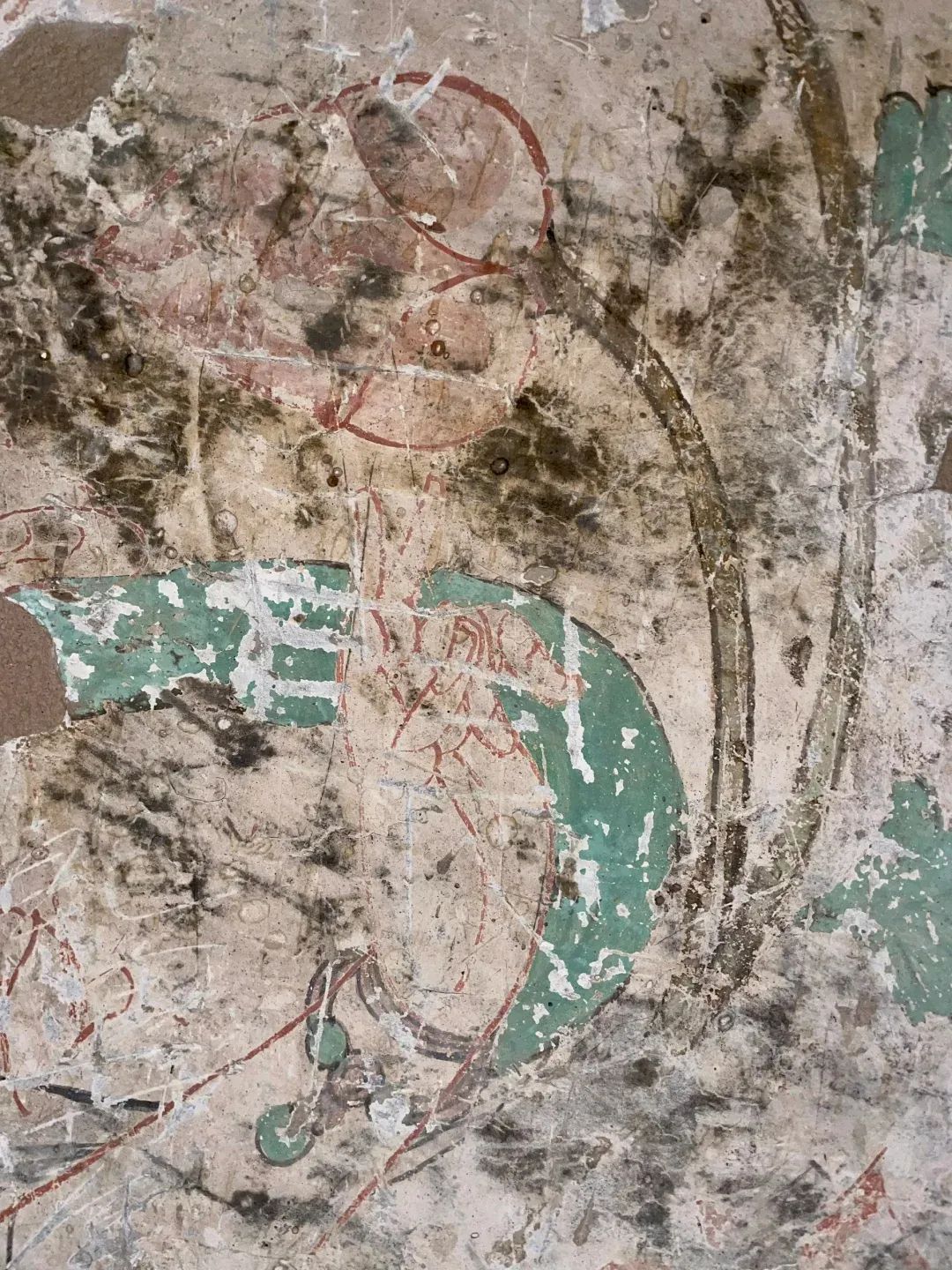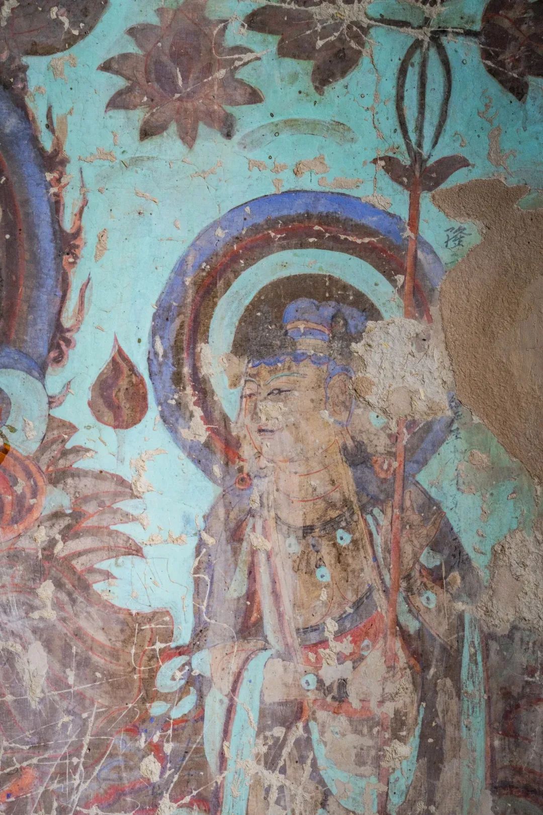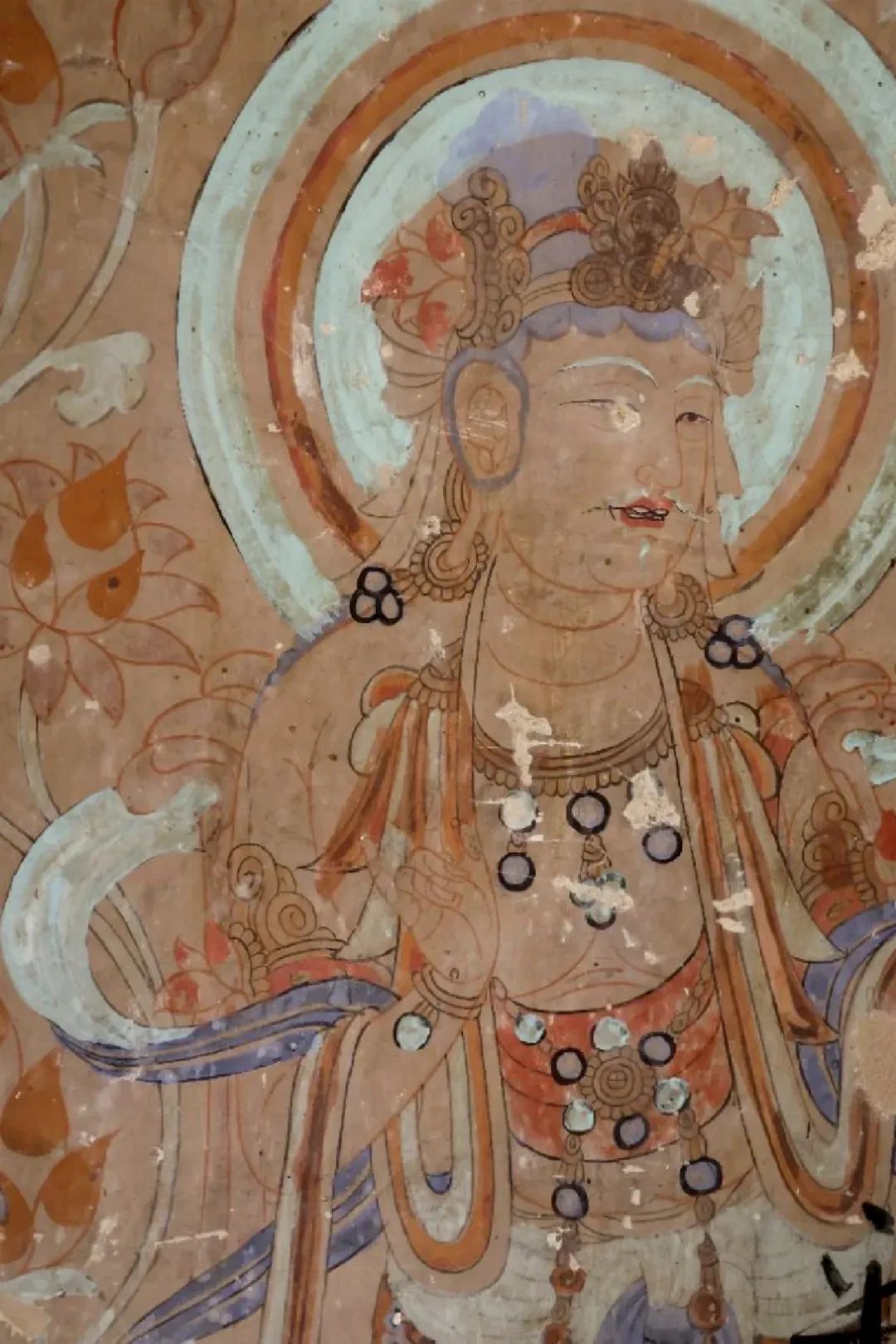昌馬石窟第4窟洞窟形制及其殘存的塑像對于研究中國早期石窟藝術(shù)與佛教造像藝術(shù)極其重要??邇?nèi)壁畫內(nèi)容是四壁上方畫條式旌幡,下畫供養(yǎng)菩薩,身高近2米,今殘存20身,菩薩周圍畫纏枝蓮,與第二窟基本相同??唔斍鞍氩康卣檀蟛糠置撀?,靠近中心柱正面上部右側(cè)的部位殘存龜形六瓣團(tuán)花圖案與一身飛天及菊花紋圖案。后部中心柱頂部周圍窟頂表面繪龜形六瓣團(tuán)花、連珠紋等圖案。