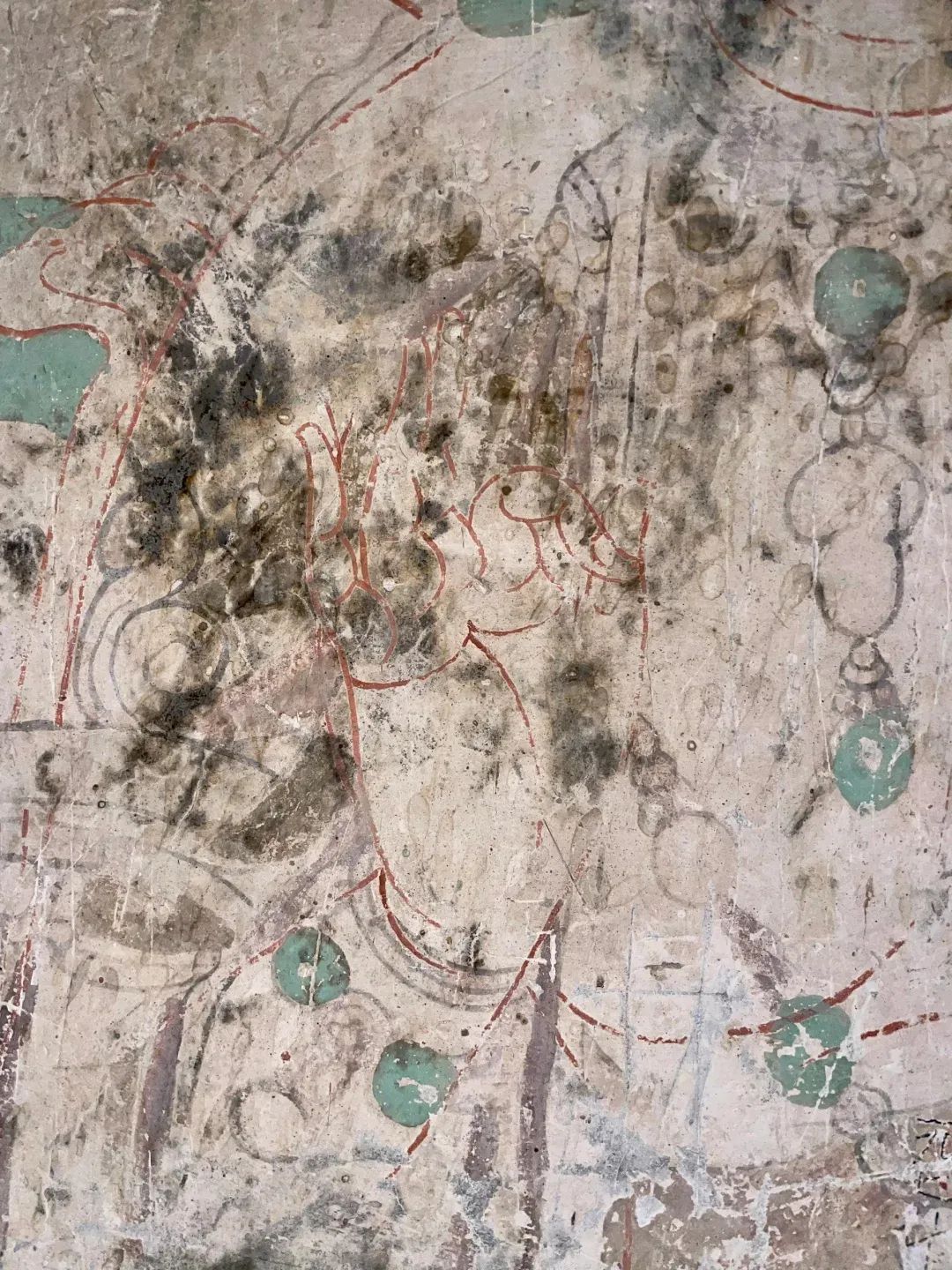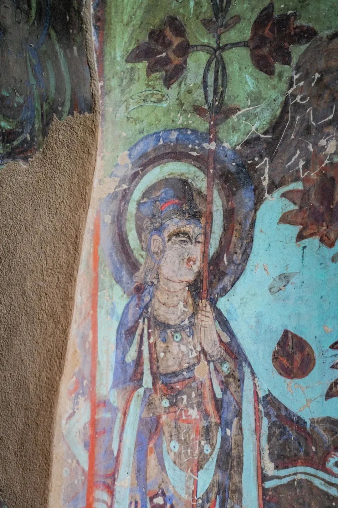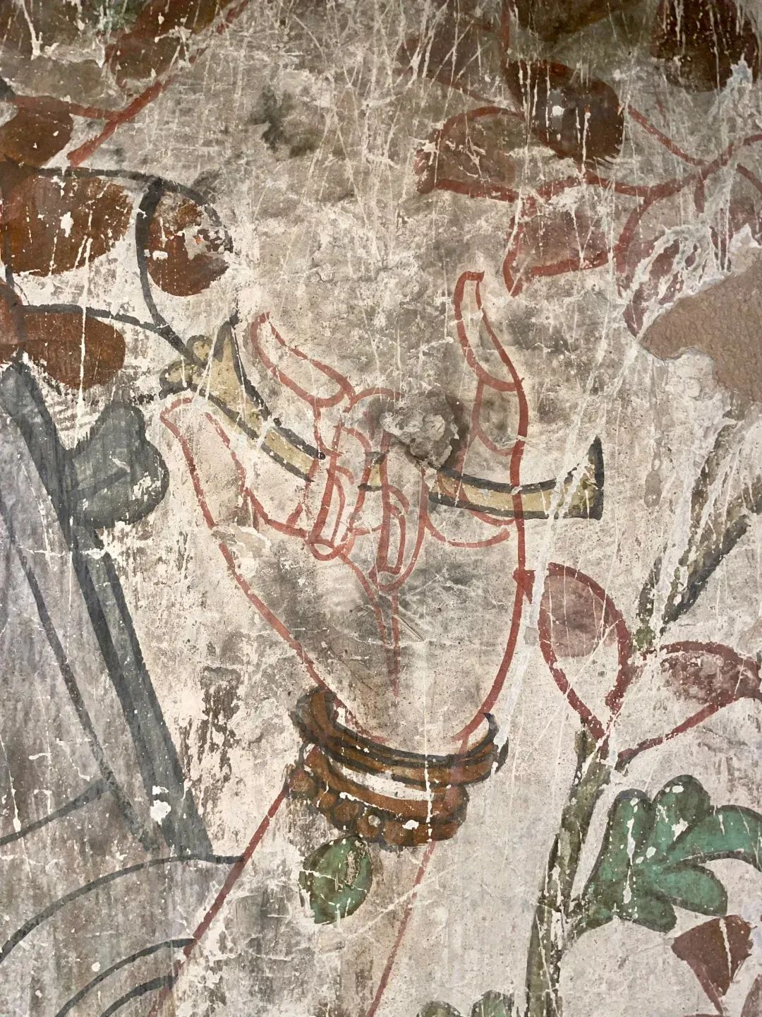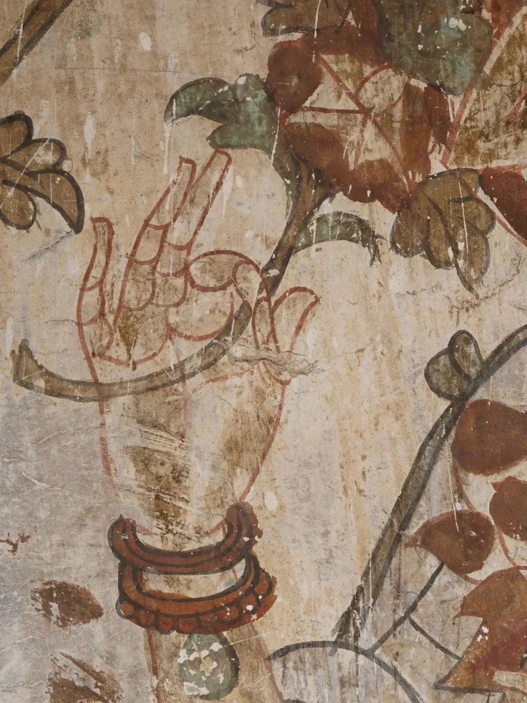 昌馬石窟第4窟洞窟形制及其殘存的塑像對于研究中國早期石窟藝術(shù)與佛教造像藝術(shù)極其重要??邇?nèi)壁畫內(nèi)容是四壁上方畫條式旌幡,下畫供養(yǎng)菩薩,身高近2米,今殘存20身,菩薩周圍畫纏枝蓮,與第二窟基本相同??唔斍鞍氩康卣檀蟛糠置撀?,靠近中心柱正面上部右側(cè)的部位殘存龜形六瓣團(tuán)花圖案與一身飛天及菊花紋圖案。后部中心柱頂部周圍窟頂表面繪龜形六瓣團(tuán)花、連珠紋等圖案。