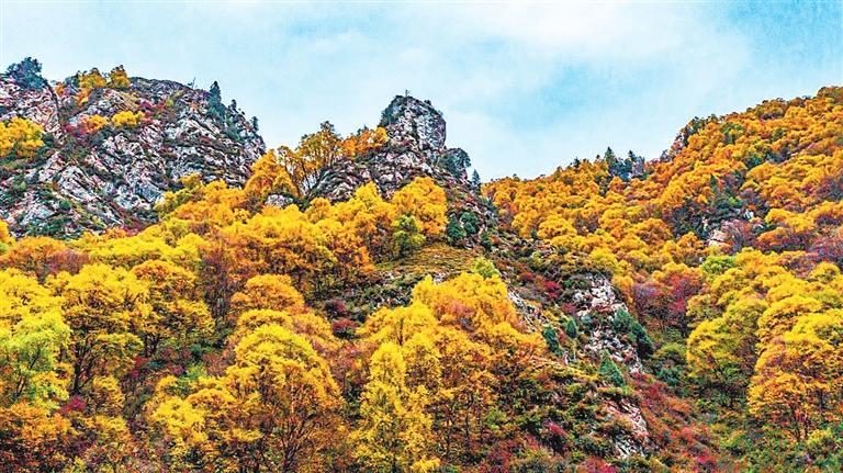 一場細雨,把漫山遍野深紅色與金黃色沖刷得更加明亮,透過秋霧的遠山,伴著秋雨的落葉,石門溝別樣的秋景令人心曠神怡??粗矍暗木跋螅挥傻孟氲匠跸牡氖T溝,那時的石門溝,滿山的杜鵑花開得正旺,遠遠望去,山坡就像是從天而降的紫色瀑布。而深秋的石門溝,卻是另一番景象。