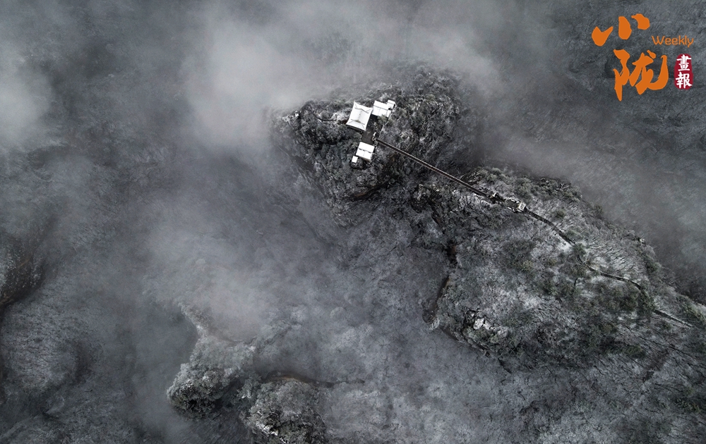 輕薄的雪花落在崆峒山巔,銀裝素裹下的樹木古剎和山下的湖泊美景分外迷人。