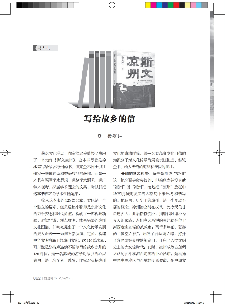 著名文化學者、作家徐兆壽教授又推出了一本力作《斯文涼州》,這本書盡管是徐兆壽寫給故鄉(xiāng)涼州的書,但完全不同于以往作家一味地眷戀和贊美故鄉(xiāng)的著作,而是一本具有深厚學術思想、深刻學術洞見、深廣學術視野、深層學術理念的文集,所以我把這本書稱之為學術性隨筆集。