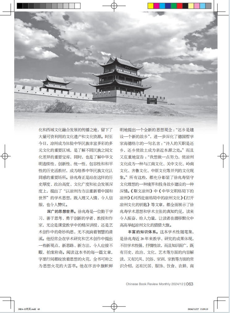 深廣的思想世界。徐兆壽是一位勤于學習、善于思考、勇于創(chuàng)新的學者、教授和作家,無論是課堂教學中的精深講授,還是藝術創(chuàng)作中的奇妙構思,無不流淌著智慧的清溪。他經(jīng)常會在學術研究和藝術創(chuàng)作中提出一些新觀點、新思路、新方法,令人應接不暇、拍案稱奇。閱讀這本書的每一篇文章,字里行間都綻放著思想的火花,全書可稱之為思想火花的大薈萃。他在序言中旗幟鮮明地提出一個全新的思想觀念 :“還鄉(xiāng)是建設一個新的故鄉(xiāng)”,進一步深化了德國哲學家海德格爾的一句名言 :“詩人的天職是還鄉(xiāng),還鄉(xiāng)使故土成為親近本源之處。”而且又莊重地宣告 :“我想做一點努力,使涼州文化成為一種與江南文化、關中文化、嶺南文化、齊魯文化、中原文化等并列的文化現(xiàn)象。”所有這些,都充分彰顯了徐兆壽堅守文化理想的一種境界和投身故鄉(xiāng)建設的一種深情?!端刮臎鲋荨分小吨腥A文明格局下的涼州》《河西走廊格局中的涼州文化》《打開涼州文化的鑰匙》等文章,都全面展示了徐兆壽學術思想和學術主張的真知灼見,讀來令人振奮、給人力量,讓讀者在潛移默化中高高舉起涼州文化的獵獵大旗。