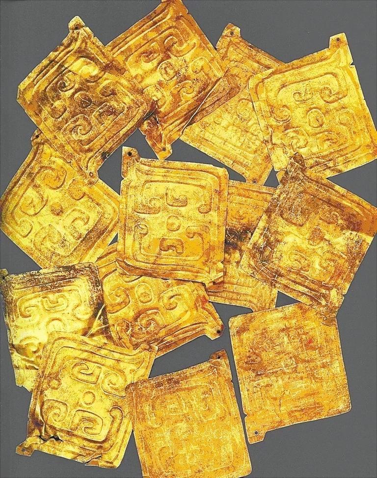 1994年春,陜西省考古研究所所長韓偉在法國、比利時(shí)訪問期間,見到了一批從香港過來的金飾片和一對(duì)金虎。韓偉先生對(duì)這組金飾片從器形、紋飾進(jìn)行了分析,并參考蘇黎世研究員莫爾夫人從金虎內(nèi)提取的木制標(biāo)本碳-14檢測(cè)結(jié)果,認(rèn)為這批金飾片為西周晚期秦人首領(lǐng)秦仲或秦莊公墓棺上的裝飾物。