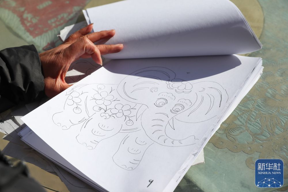 1月5日,在慶陽市合水縣西華池鎮(zhèn)唐旗村,張雪峰展示創(chuàng)作黃河古象主題剪紙時的草稿。