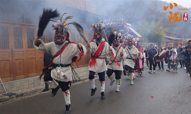 在白馬語言中,“池哥”意為山神,“晝”即舞。每年春節(jié)期間,文縣白馬山寨都會表演池哥晝,舞隊一般由9人組成,其中4人扮成山神(池哥),2人扮成菩薩(池姆),2人扮成夫妻(池瑪),還有1個兒童扮成猴娃子。他們從早到晚挨家逐戶地表演,意在為村民除惡祛邪,祈求吉祥。表演時,舞者頭戴青面獠牙的木雕彩繪面具,身著特色服飾,舞步遒勁粗獷,舞姿有殺野豬、打老虎等動作,既帶有神秘的氣息,又顯示出濃厚的娛樂色彩。