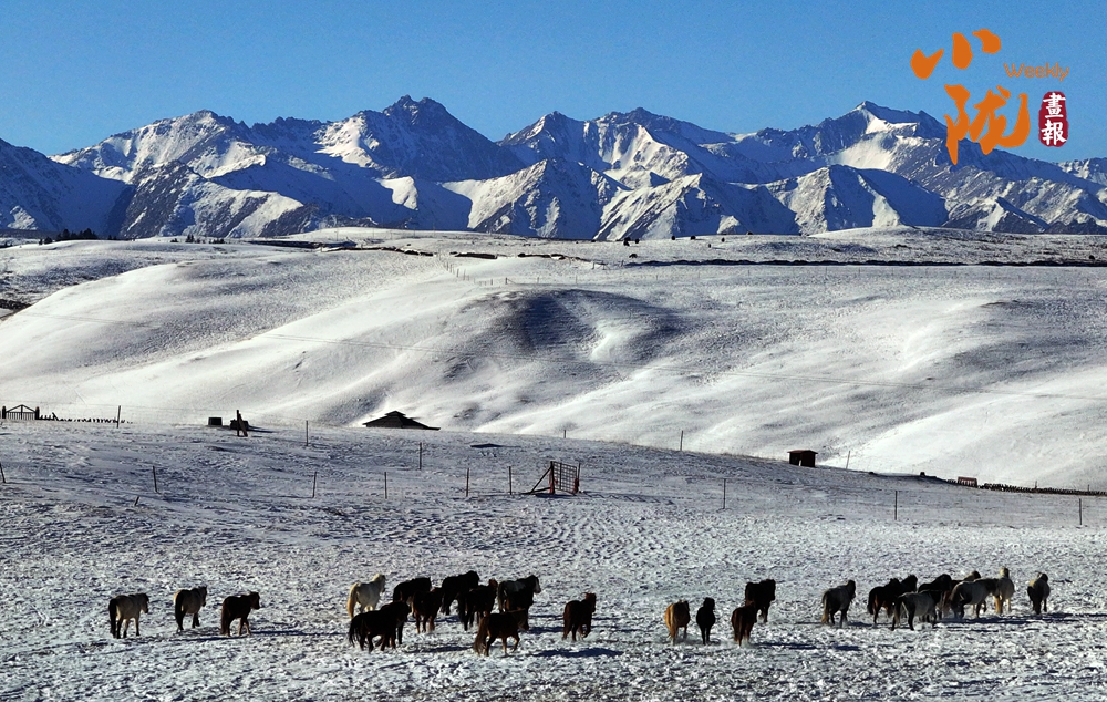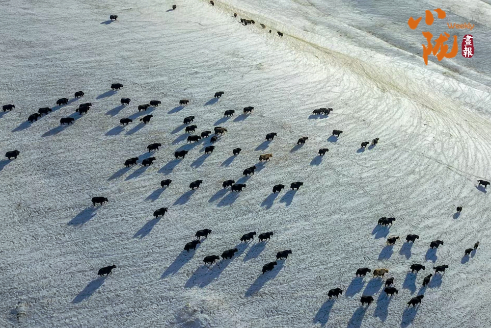 牛群在雪地中悠閑地覓食,和雪景相映成趣,給這片寧靜的草原帶來了生機(jī)與活力。