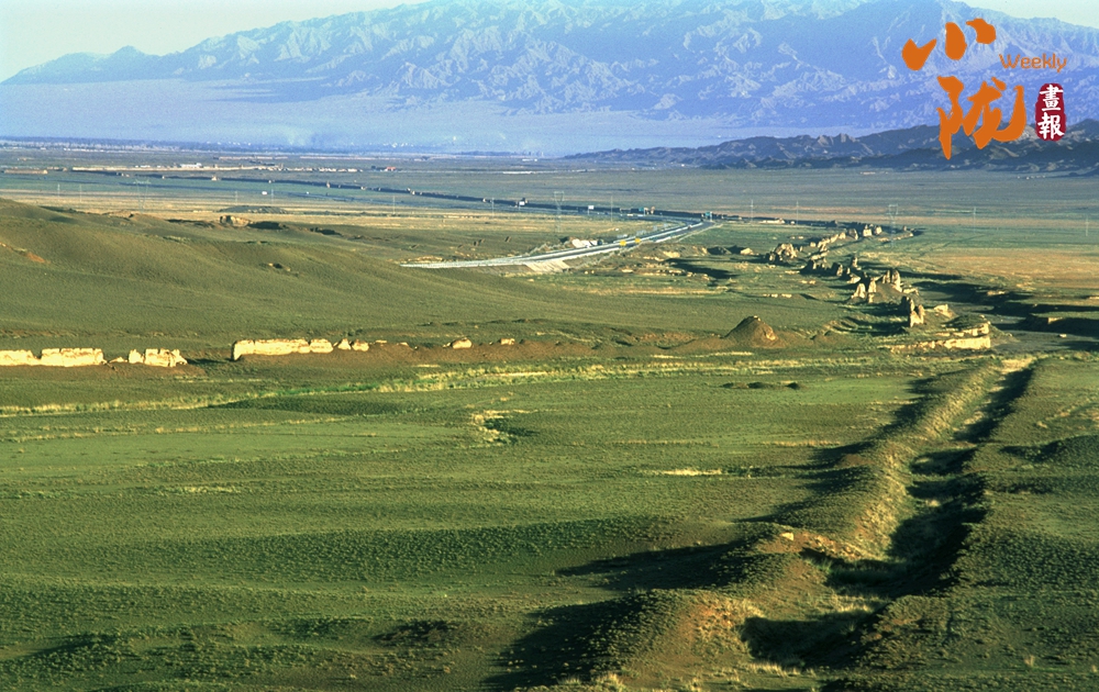 在黛藍(lán)色山脈的映襯下,漢明長城蜿蜒并行,高于地面的黃色城墻是明長城,而顏色稍深的壕溝是漢長城,兩條跨越千載的古長城最近處不過十余米,仿佛攜手講述著遠(yuǎn)古的故事……它們也猶如兩位忠誠的衛(wèi)士,守護(hù)著這片古老的土地,也見證了絲綢之路的興衰變遷。