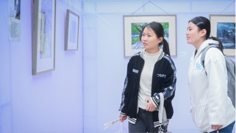該校學生在認真品鑒精品畫作