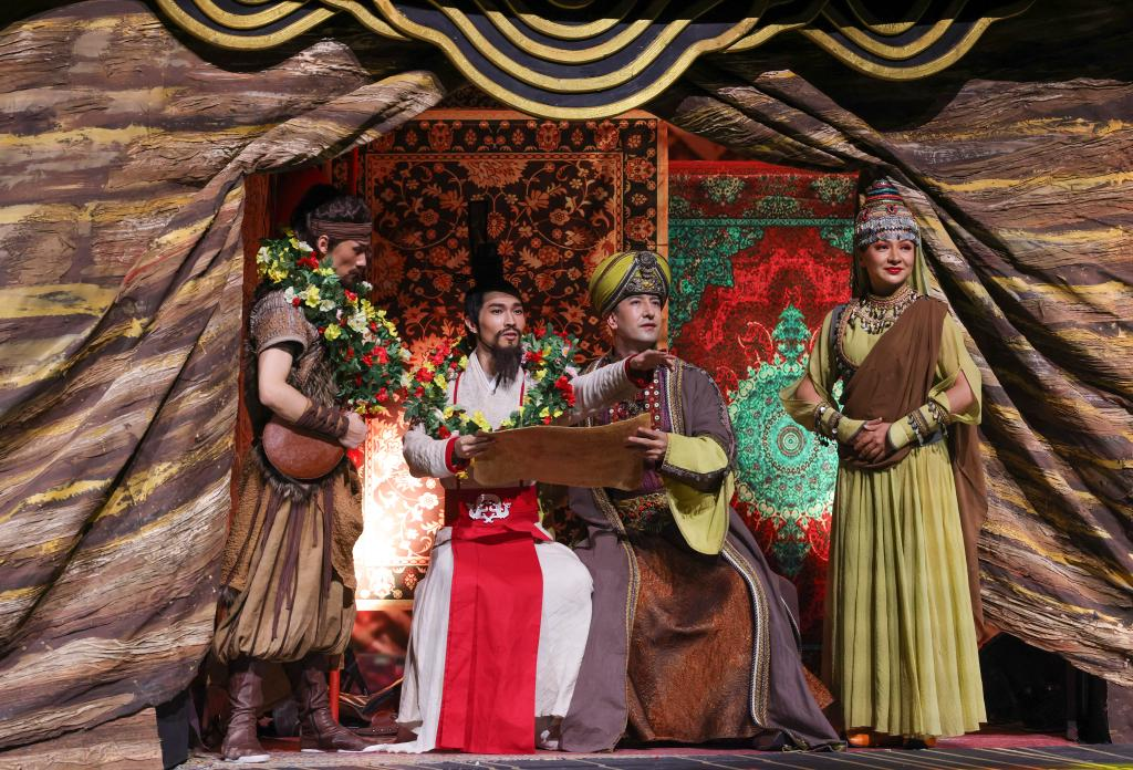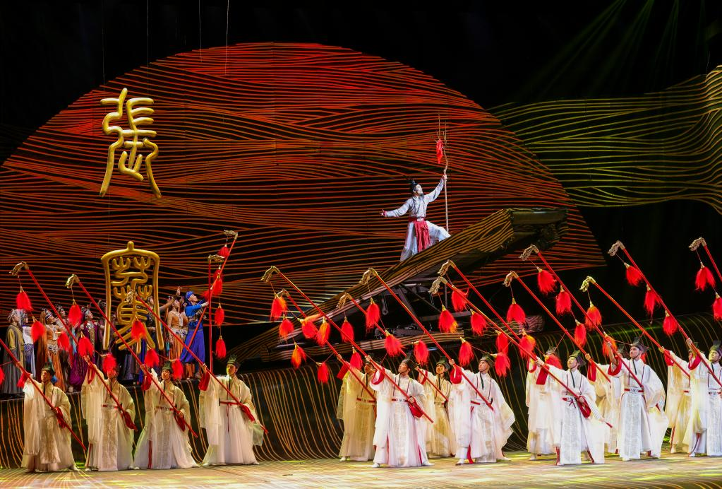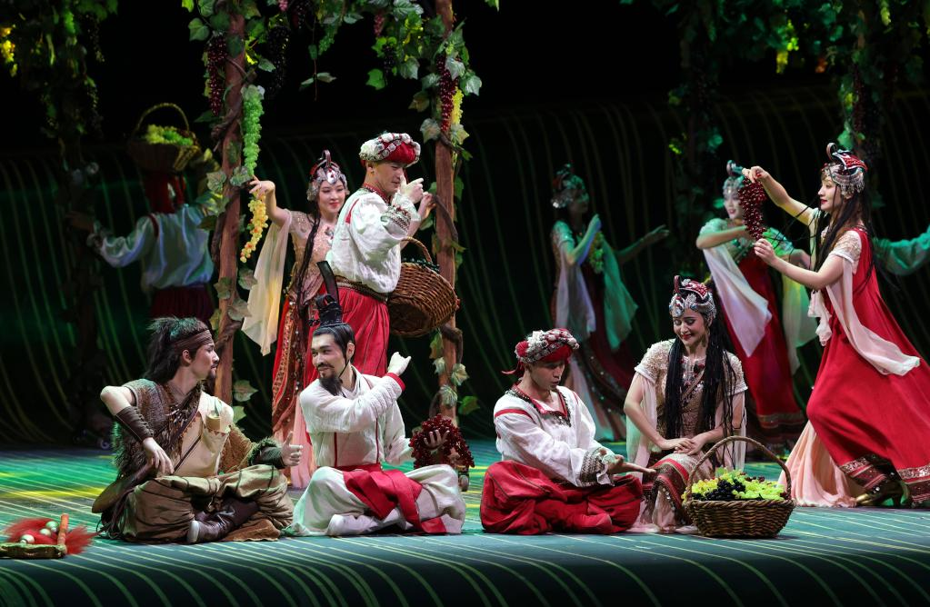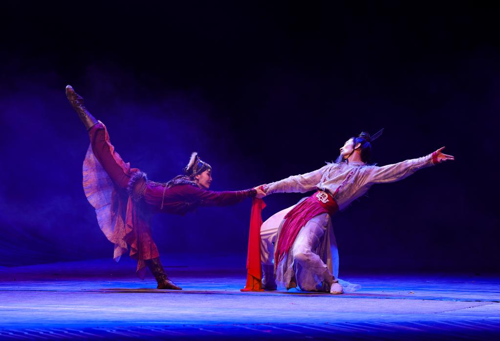 10月27日晚,在烏魯木齊文化中心大劇院,演員在舞劇《張騫》中表演。 10月27日晚,以漢代張騫出使西域?yàn)樗{(lán)本創(chuàng)作的重大歷史題材舞劇《張騫》,在烏魯木齊文化中心大劇院首演。該劇由《授節(jié)》《守節(jié)》《傳節(jié)》《使節(jié)》四幕組成,演繹了張騫出使西域的“鑿空之旅”,展現(xiàn)了各民族廣泛交往、全面交流、深度交融的生動(dòng)場(chǎng)景。 新華社記者 王菲 攝