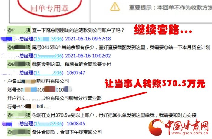據(jù)了解,6月16日上午9時20分左右,安寧區(qū)某公司財務人員岳先生收到一封由“公司股東”發(fā)來的電子郵件,在郵件中推送了一個新建的QQ工作群,岳先生沒有多想就加入了此群。不久后,詐騙分子在此QQ群中冒充該公司法人和另外一名財務人員對岳先生下達指令,要求其向?qū)Ψ街付ㄣy行賬戶轉(zhuǎn)賬合同款370.5萬元。