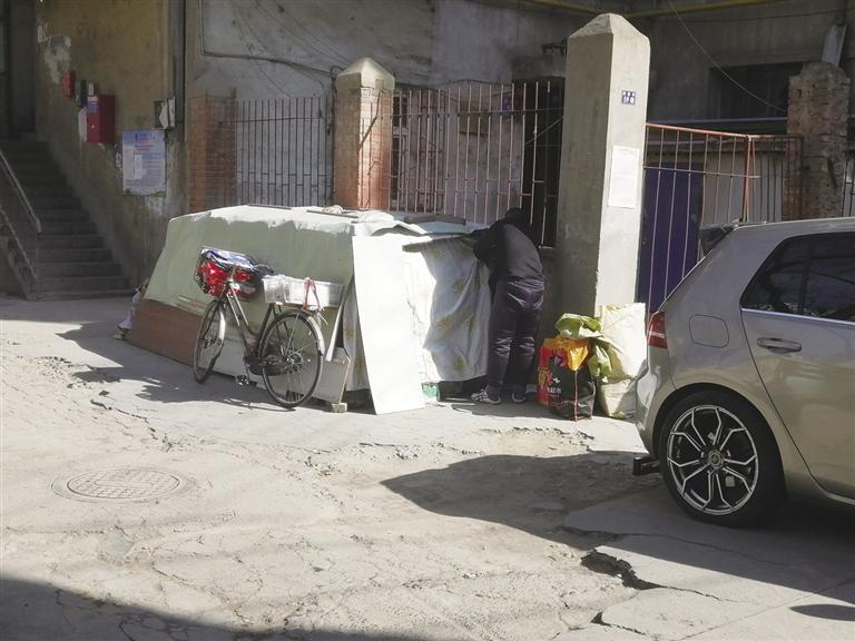隨后,記者來到閔家橋59號,破舊的小區(qū)內(nèi)堆積的雜物很多,有人堆積紙箱,有人干脆在小區(qū)院子內(nèi)“圈地”堆放私人物品。“不知道人家在堆放什么,可是進(jìn)門就能看見,很不雅觀。”居民李先生說,小區(qū)是老舊樓院,長期沒人管理,衛(wèi)生環(huán)境雖然不差,但是小區(qū)內(nèi)堆積的東西太多。小區(qū)里有一個收廢品的,每天將回收來的紙箱堆積在單元樓門口,另一戶人家干脆“圈地”將自家的私人物品堆放在這里,用塑料布遮蓋起來,很不美觀。