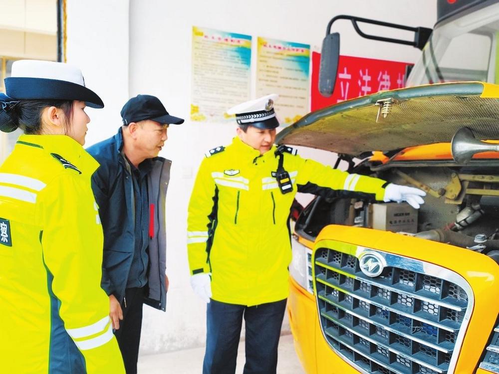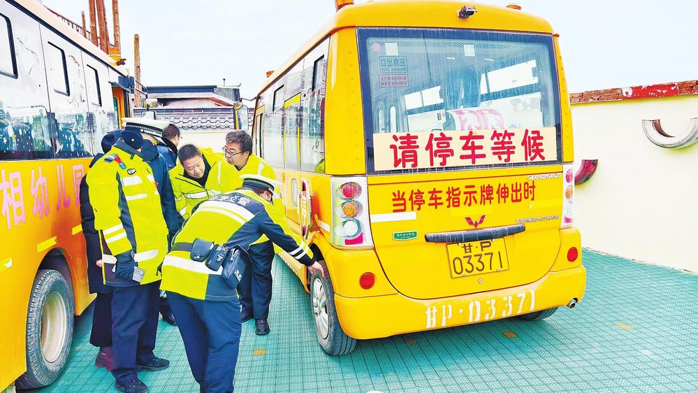 民警在檢查幼兒園校車(chē)。開(kāi)學(xué)在即,為保障學(xué)生上下學(xué)乘車(chē)安全,2月18日,臨潭縣公安局交警大隊(duì)聯(lián)合縣交通運(yùn)輸局對(duì)校車(chē)開(kāi)展“安全體檢”。 新甘肅·甘肅法治報(bào)記者金凡裕攝