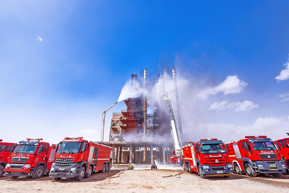 在“次生災(zāi)害滅火救援”科目現(xiàn)場(chǎng),化工園區(qū)內(nèi)的熊熊烈焰映紅了半邊天。消防員身著隔熱服操控滅火機(jī)器人抵近火源,高噴車(chē)噴射出的泡沫如瀑布般覆蓋燃燒裝置,移動(dòng)炮陣列織就立體火網(wǎng)。從突破火線(xiàn)到追殲火頭,從清理余火到看守火場(chǎng),救援人員輪替堅(jiān)守在一線(xiàn),成功阻止火勢(shì)的蔓延。