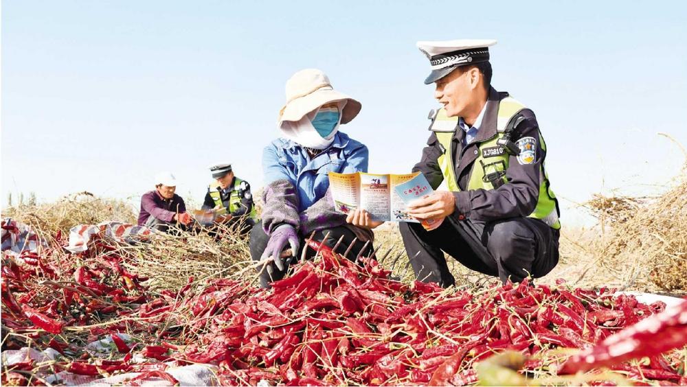 民警在田間地頭向群眾講解交通安全知識(shí)