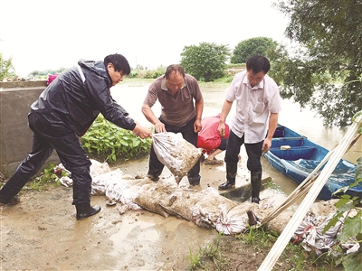 7月13日,江蘇省宜興市丁蜀鎮(zhèn)紀檢干部到該鎮(zhèn)雙廟村防汛一線,在督促履行抗洪搶險職責的同時,與當?shù)馗刹咳罕娨坏兰庸毯拥?。毛光?nbsp;攝