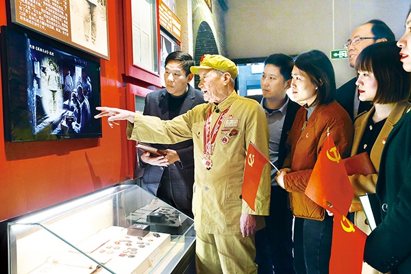 圖為江蘇省宜興市紀(jì)檢監(jiān)察干部參觀黨史陳列館,聆聽(tīng)有65年黨齡的老黨員講述抗戰(zhàn)經(jīng)歷。鄒宜賓 攝