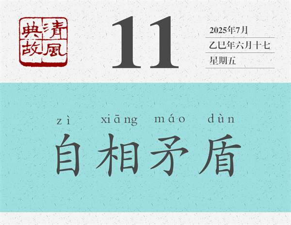 “自相矛盾”的本義是,不管是自己的矛刺穿了自己的盾,還是自己的盾無法被自己的矛刺穿,都會陷入不能自圓其說的難堪境地。后人則以“自相矛盾”為典,比喻一個(gè)人前面說的和后面說的、前面做的和后面做的相互抵觸,或者自己所說與所做、自己所為與所述互相沖突。也指同一機(jī)關(guān)、同一機(jī)構(gòu)中各個(gè)部門、各個(gè)成員之間說法不統(tǒng)一,行為不一致。宋人王觀國《學(xué)林·言行》:“圣賢言行,要當(dāng)顧踐,毋使自相矛盾。”