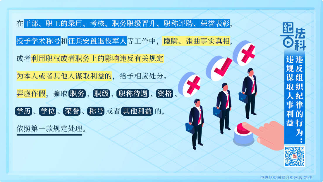 第一款規(guī)定,在干部、職工的錄用、考核、職務(wù)職級(jí)晉升、職稱評(píng)聘、榮譽(yù)表彰,授予學(xué)術(shù)稱號(hào)和征兵安置退役軍人等工作中,隱瞞、歪曲事實(shí)真相,或者利用職權(quán)或者職務(wù)上的影響違反有關(guān)規(guī)定為本人或者其他人謀取利益的,給予相應(yīng)處分。