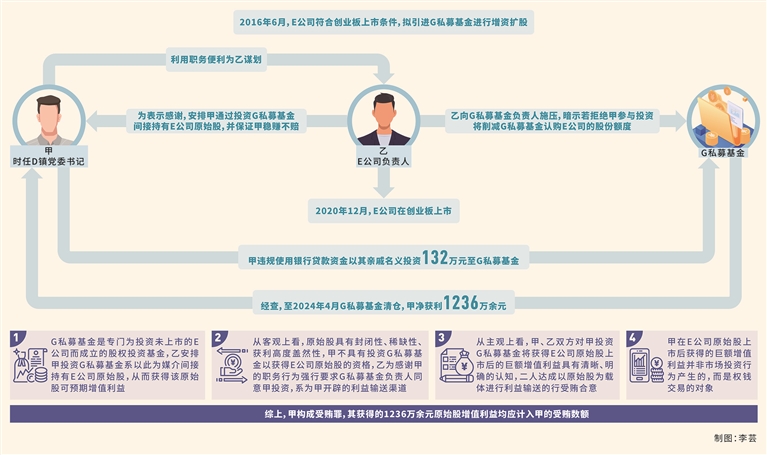 其中,2016年6月,E公司符合創(chuàng)業(yè)板上市條件,擬引進(jìn)G私募基金和H私募基金進(jìn)行增資擴(kuò)股。乙為感謝甲在企業(yè)用地審批等方面提供的幫助,提議安排甲通過投資G私募基金(該基金是專門為投資未上市的E公司而成立的股權(quán)投資基金,按照每股5.5元的價格取得E公司股本600萬股,并辦理相應(yīng)的變更登記手續(xù))間接持有E公司原始股,并告知甲E公司擬上市情況以及其會與G私募基金簽訂對賭協(xié)議(若E公司未實(shí)現(xiàn)上市,G私募基金有權(quán)要求乙原價回購,并按照年利率10%支付補(bǔ)償款),甲無需承擔(dān)市場風(fēng)險,穩(wěn)賺不賠,甲表示同意。此后,乙向G私募基金負(fù)責(zé)人施壓,暗示若拒絕甲參與投資將削減G私募基金認(rèn)購E公司的股份額度,并將該額度交由其競爭對手H私募基金認(rèn)購。隨后,甲違規(guī)使用銀行貸款資金以其親戚名義投資132萬元至G私募基金(根據(jù)相關(guān)規(guī)定,私募基金投資者應(yīng)當(dāng)具備相應(yīng)資金實(shí)力,不得用貸款資金從事股本權(quán)益性投資,甲的行為不符合規(guī)定)。2019年6月,I私募基金以每股11.52元溢價收購G私募基金持有的部分E公司股份。2020年12月,E公司在創(chuàng)業(yè)板上市。經(jīng)查,至2024年4月G私募基金清倉,甲凈獲利1236萬余元。