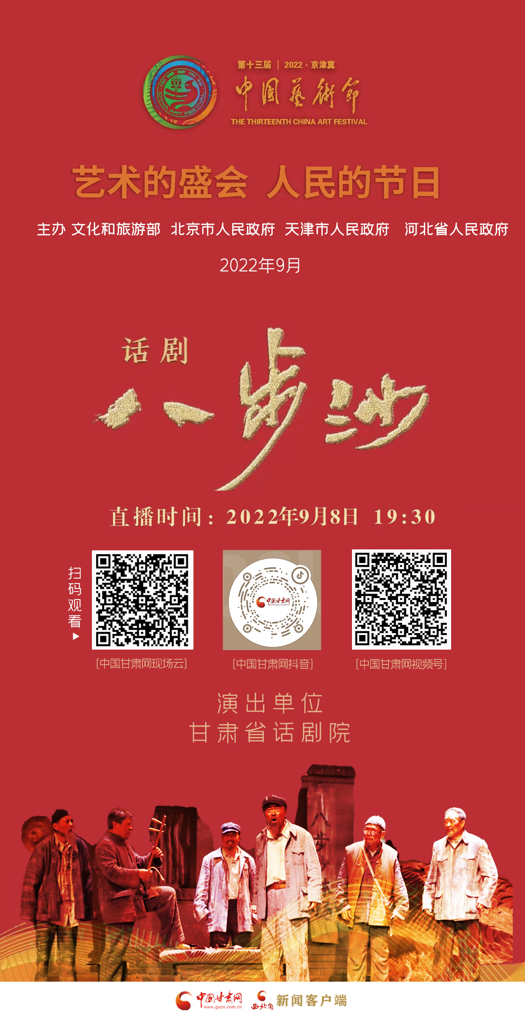 9月1日,由文化和旅游部、北京市政府、天津市政府、河北省政府共同主辦的第十三屆中國藝術節(jié)在北京開幕。隨著藝術節(jié)大幕徐徐拉開,劇目展演和“文華獎”評審工作同步展開,入圍第十七屆文華大獎終評作品的話劇《八步沙》將代表甘肅省,與全國新創(chuàng)排的38部舞臺藝術作品一起角逐最終的文華大獎。根據疫情防控要求,話劇《八步沙》將以線上評審的方式參演,期待廣大觀眾屆時觀看并點評。