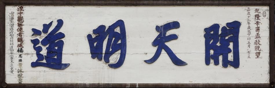 該匾懸于天水伏羲廟大門前牌坊正中。長(zhǎng)3.5米,寬1.25米,厚0.12米。素邊,匾心白底藍(lán)字,上下款朱書。此匾有雙上款和雙下款。第一個(gè)上款為“乾隆辛酉孟秋既望”,下款為“湟中觀察使者遼海楊應(yīng)琚薰沐敬書”;第二個(gè)上款為“嘉慶十二年歲次丁卯五月吉旦”,下款為“中憲大夫?qū)幭母蜓a(bǔ)知秦州事王公重建”。