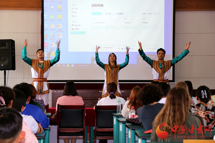 活動中,蘭州交通大學附屬中學組織七、八年級用英語表演了詩歌朗誦、話劇、合唱、獨唱等節(jié)目,來華留學生代表獻上了土庫曼斯坦傳統(tǒng)舞蹈表演,現(xiàn)場氣氛熱烈。