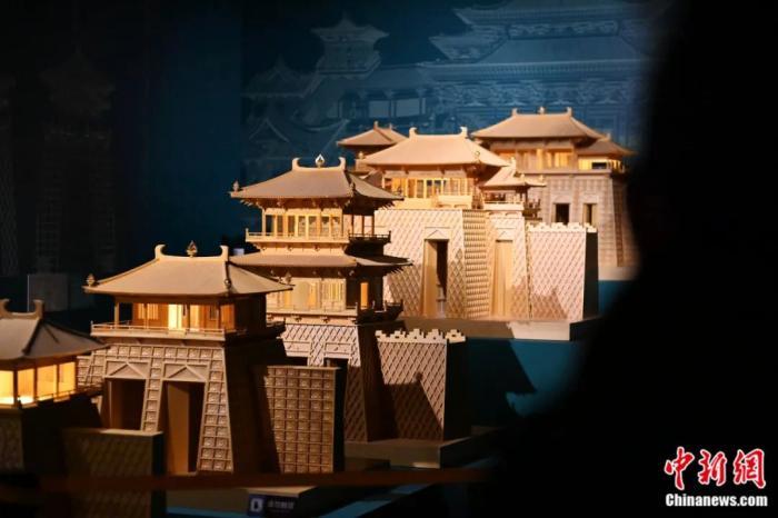 《千年?duì)I造——敦煌壁畫(huà)中的建筑之美》特展上的古代建筑模型。該模型的“單門(mén)道花磚城門(mén)”來(lái)源于莫高窟第159窟。李亞龍 攝