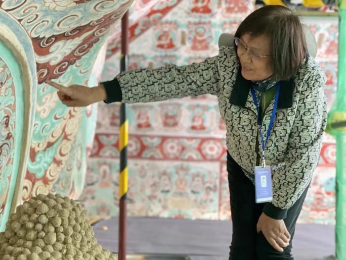 2023年7月14日,孫毅華向中新社記者介紹敦煌壁畫(huà)中的建筑形象。李亞龍 攝