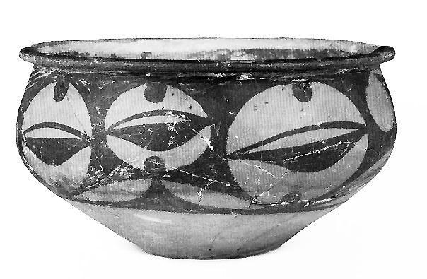 展廳陳列的寬帶紋缽、魚(yú)紋盆、彩陶葫蘆瓶主要是仰韶早期彩陶的代表作。其中魚(yú)紋圖案是仰韶文化的標(biāo)志性紋飾,從最初的寫實(shí)風(fēng)格演變到抽象化、簡(jiǎn)單化。陳列的幾件魚(yú)紋盆清晰地顯示了這個(gè)變化過(guò)程。中期彩陶構(gòu)圖以弧線為主,線條流暢柔美,圖案華麗精巧。常見(jiàn)紋飾有弧形三角紋、迴旋勾連紋、花瓣紋等,表現(xiàn)出大自然生機(jī)勃勃、欣欣向榮的景象。展出的典型器有三角紋彩陶缽、網(wǎng)格紋彩陶盆、勾葉紋彩陶盆等。晚期彩陶數(shù)量雖呈下降趨勢(shì),但工藝卻比中期更為成熟,大型彩陶器以及內(nèi)壁繪彩的制作方法開(kāi)始出現(xiàn)。常見(jiàn)的紋飾有弧邊三角形、圓點(diǎn)圓圈紋、漩渦紋、網(wǎng)格紋等,還有個(gè)別蛙紋、犬紋。鋸齒紋彩陶壺、花瓣紋彩陶盆、弧三角網(wǎng)格紋盆均為這個(gè)時(shí)期的精品佳作。該時(shí)期流行的一些彩陶元素如內(nèi)彩、鋸齒紋、平行線紋、漩渦紋等被后世的馬家窯文化吸收繼承并發(fā)揚(yáng)光大。