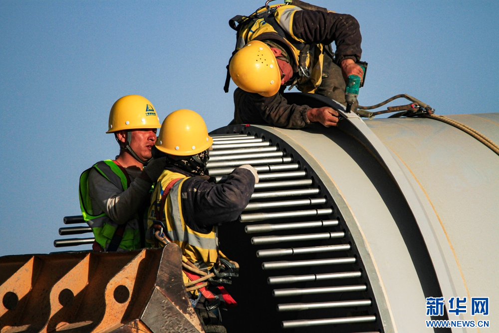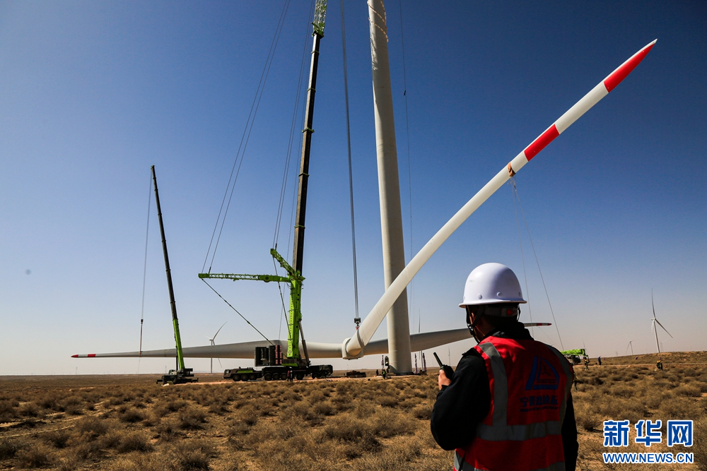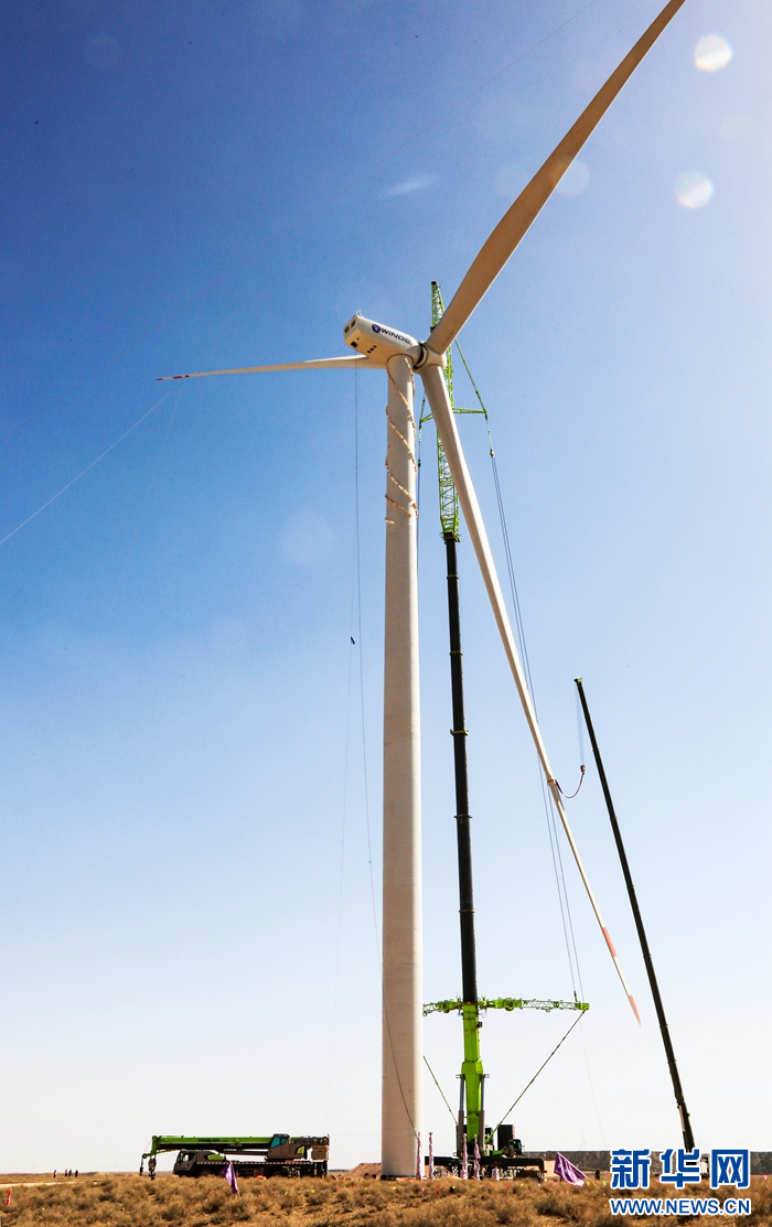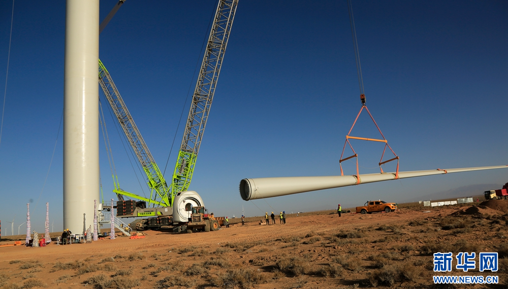 近日,在甘肅省張掖市甘州區(qū)平山湖20千瓦風電施工現(xiàn)場,工人們緊張有序地進行風電設備安裝工作。新華網(wǎng)發(fā)(陳禮 攝)