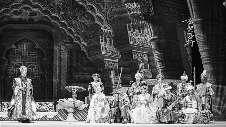 《玄奘西行》靠音樂(lè)的轉(zhuǎn)換,把人物內(nèi)心通過(guò)音樂(lè)表達(dá)出來(lái),將人物的心理變化賦予戲劇張力。姜瑩給甘肅省歌舞劇院演出的《玄奘西行》專門配了一版交響樂(lè)的伴奏,希望通過(guò)交響樂(lè)把底子鋪好,通過(guò)交響樂(lè)和民樂(lè)的融合達(dá)到氣勢(shì)恢宏的效果。