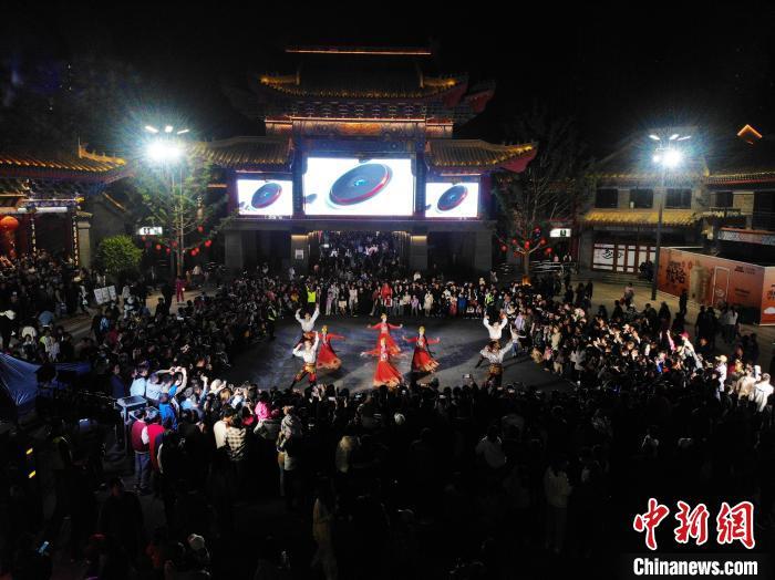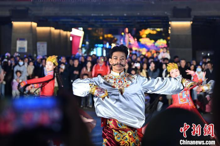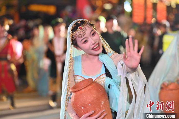 5月3日晚,甘肅省蘭州市七里河區(qū)蘭州老街上演的大型情景巡游《樓蘭之旅》吸引游客。李亞龍 攝