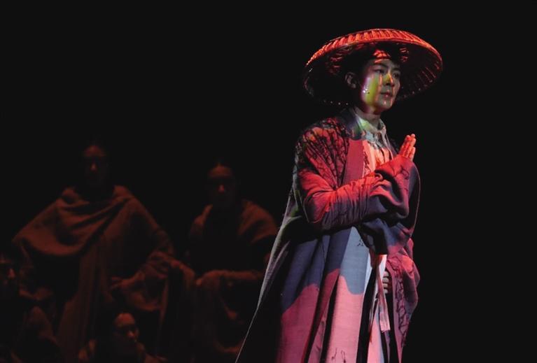 在音樂劇《飛天》的舞臺上,敦煌元素豐富,各色形象躍然而出。無論是對《鹿王本生》《千釘求法》《入海求珠》《舍身飼虎》四則經典故事的再現(xiàn),還是九色鹿、烏鴉、勞度叉、枇楞揭梨、公主、善友等各色形象的還原,抑或對第257窟、第275窟、第296窟、第428洞窟等石窟壁畫的描摹再現(xiàn),古今歷史的交疊盡現(xiàn)眼前……敦煌壁畫中那些靜默千年的人物,宛如靈魂覺醒般緩緩浮現(xiàn),穿越了千年的歲月長河,與觀眾進行了一場跨越時空的深情對話。