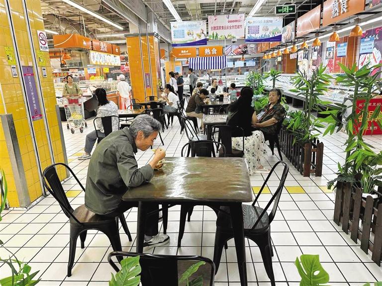 超市里的“平價食堂”,成為打造一刻鐘便民生活圈的重要載體。“超市周邊的居民、上班族、學(xué)生、酒店差旅客群的基礎(chǔ)比較大,所以增加快餐、堂食也是超市的一項(xiàng)便民舉措。”超市里升騰起的煙火氣,也讓超市的來客率明顯提升,“周末時,油條的銷量能達(dá)到1000根、豆腐腦能賣到500碗,不管是檔口、自助收銀機(jī)都有排隊的顧客。”