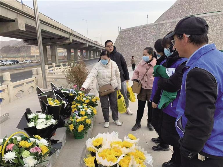 市民在墓區(qū)門(mén)外購(gòu)買(mǎi)鮮花